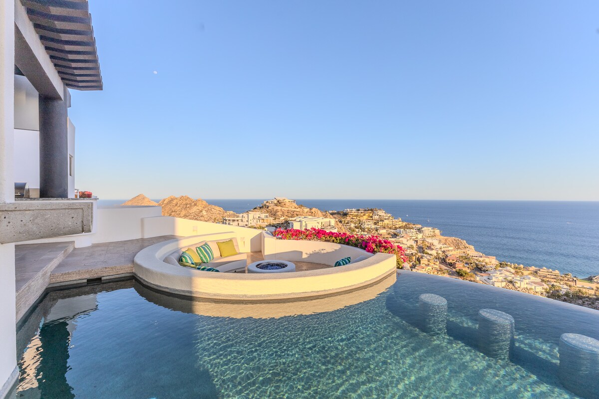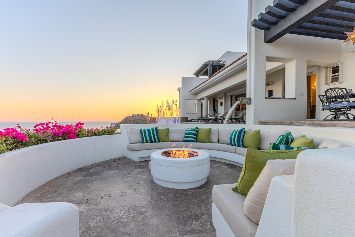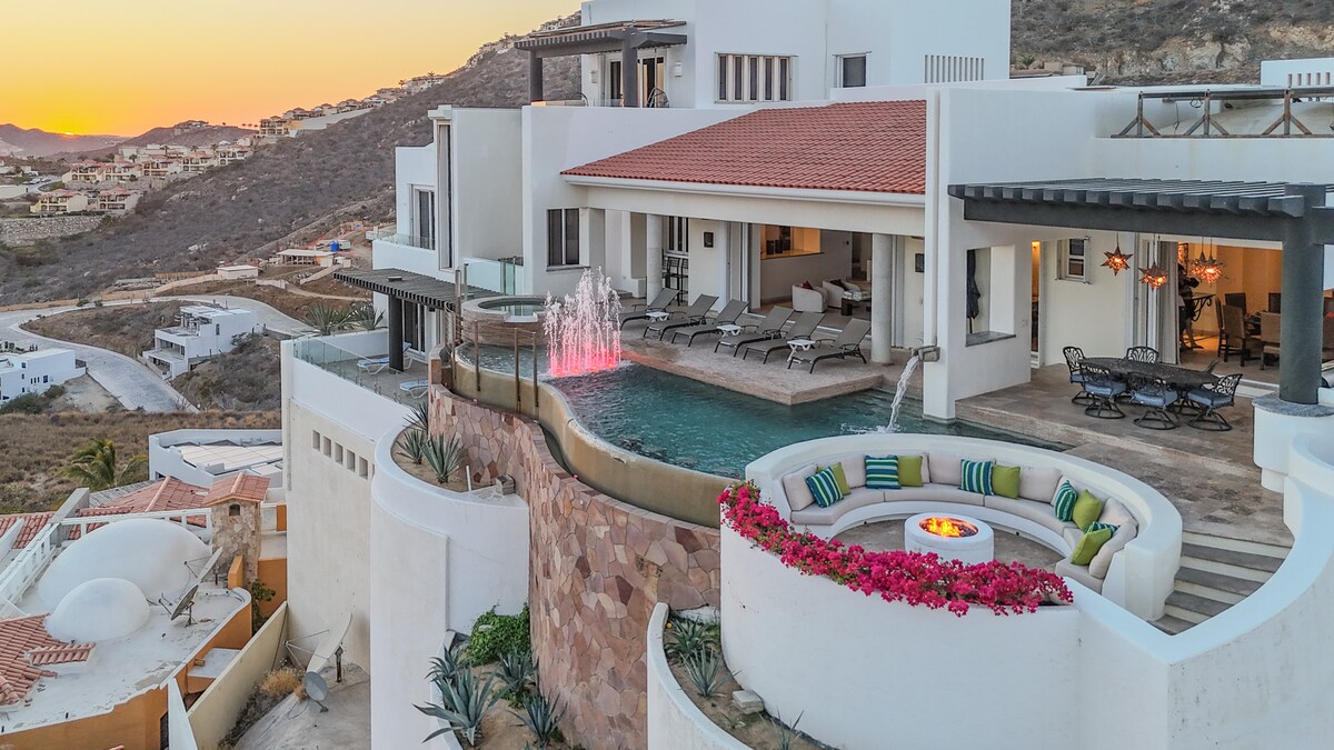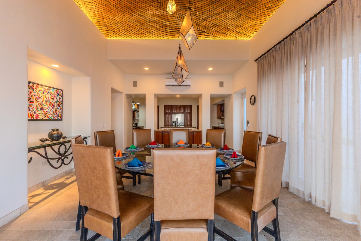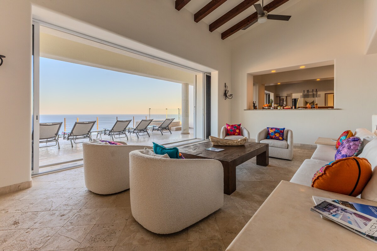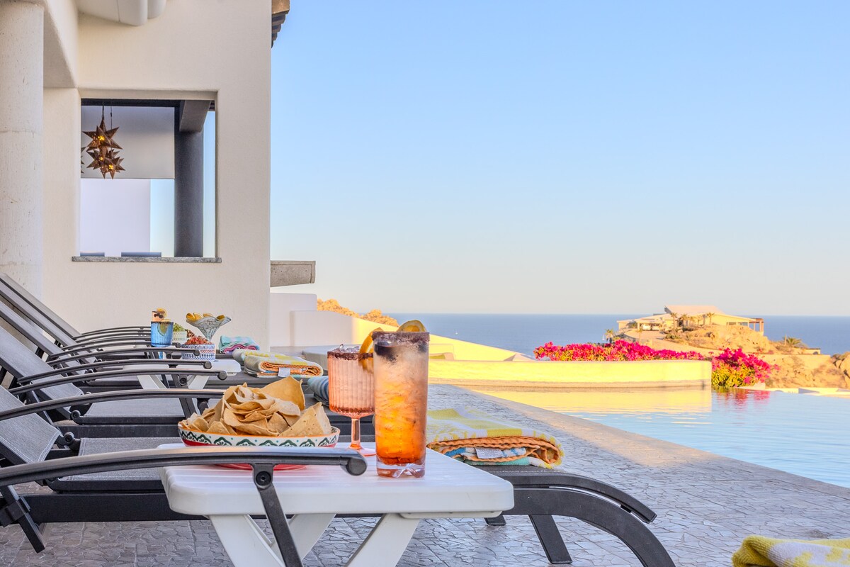 Enjoy the most amazing vacation in this spacious and serene Mexican Villa, located in the hills of Pedregal, a gated community just a few minutes from Downtown Cabo San Lucas and Cabo Marina. Enjoy ocean views from every bedroom, the best sunsets from the infinity pool, a fresh margarita from Mi Casa’s fantastic butler, or having one of the chefs prepare you a home-cooked, authentic dinner. Truly a unique experience.